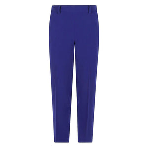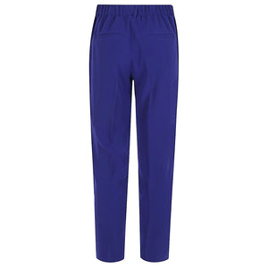 Soft blue trousers with elasticated waist, belt loops, two side patch pockets, straight hem. Light cady trousers