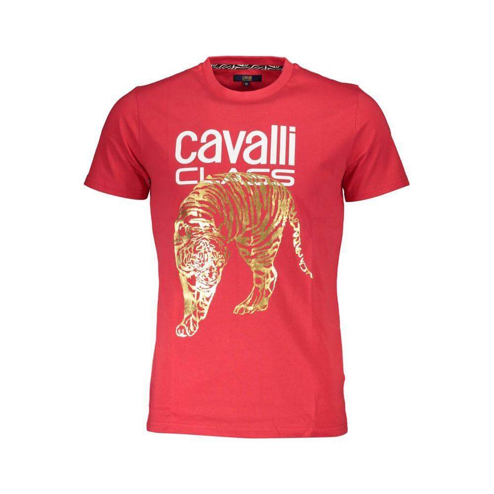 Elevate your style with the Cavalli Class T-Shirt, a bold statement in luxury fashion. This vibrant red tee, featuring a sharp crew neck and short sleeves, is accented with an eye-catching Cavalli Class print and logo, exuding an air of exclusivity and trendsetting design. Crafted from premium cotton, it promises comfort and durability while keeping you in vogue. Perfect for the fashion-forward individual looking to make an impact with every ensemble.