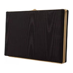 حقيبة يد صغيرة رائعة جديدة تمامًا مع البطاقات والعلبة، موديل أسود، مغطاة بقماش حريري كثيف. الحقيبة الصغيرة مغلقة بغطاء بإطار ذهبي.
