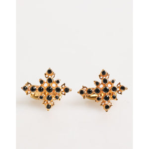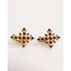 featuring a gold-tone brass construction in a cross design, elegantly embellished with sparkling crystals. A luxurious piece that adds standout detail to any formal or designer ensemble.
