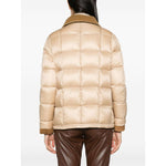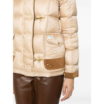 blush beige feather down padded design quilted leather trim corduroy collar concealed front fastening and hook fastening long sleeves contrasting cuffs two side flap pockets Nylon down jcket Size and Fit - This piece fits true to size. We recommend you get your regular size. Model is 1,75m / 5ft 8in wearing size S