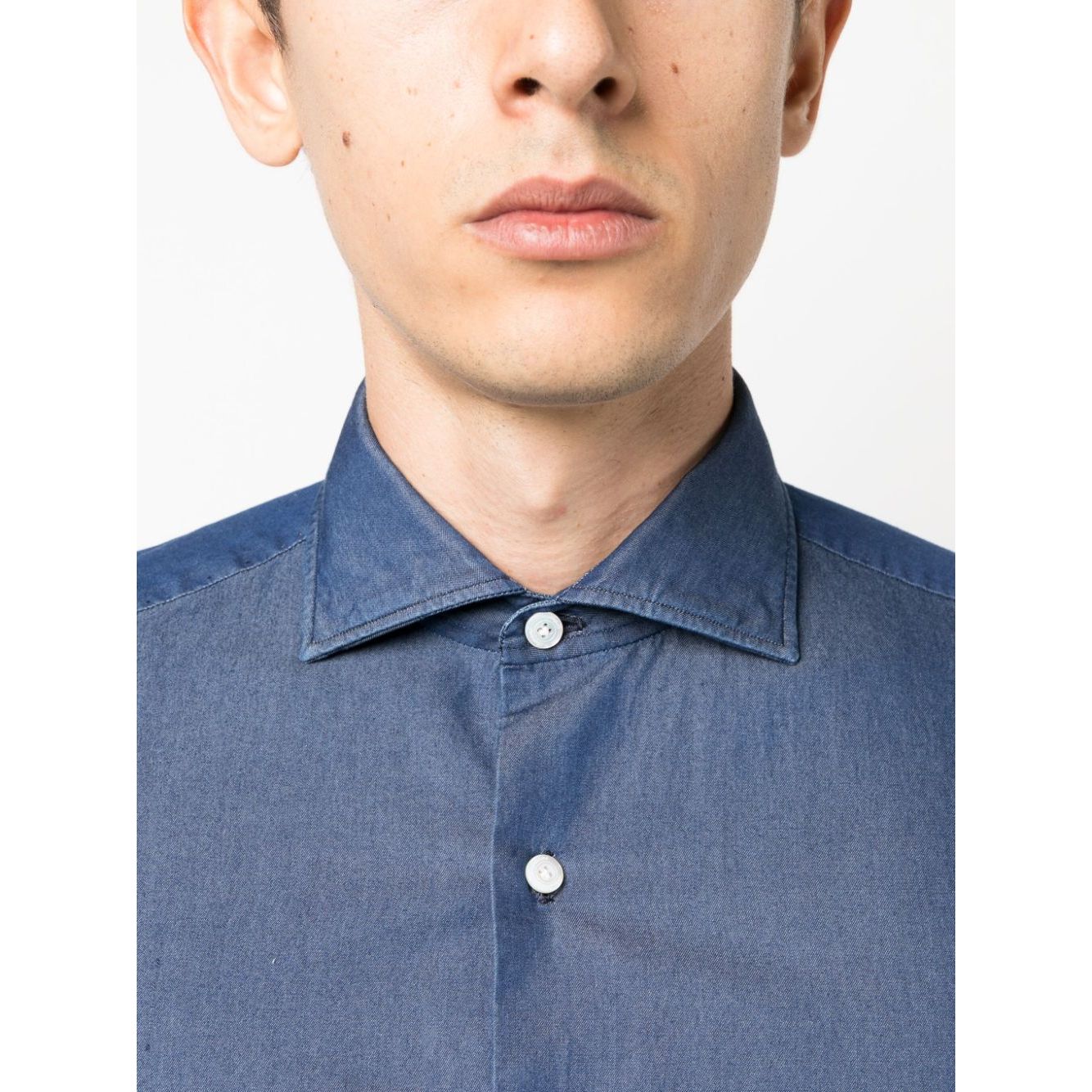 قميص قطني أزرق داكن بياقة واسعة وأزرار أمامية وأكمام طويلة وأصفاد بأزرار وحاشية منحنية في الخلف المقاس والملاءمة - هذه القطعة تناسب المقاس الحقيقي. نوصيك بالحصول على مقاسك المعتاد. يبلغ طول العارضة 1.84 متر / 6 أقدام و1 بوصة وترتدي مقاس 39 (طوق سم)