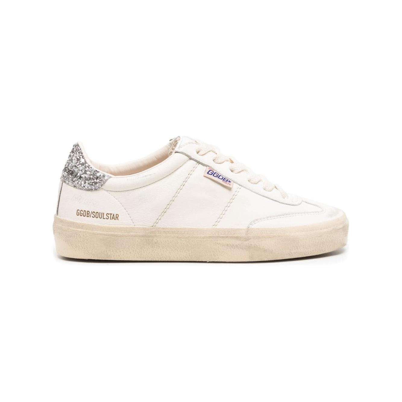 white leather glitter detailing logo tag gold-tone logo lettering round toe front lace-up fastening contrasting branded heel counter branded insole flat rubber sole Soul-Star leather sneakers Size and Fit - Heel 0,8 in / 2 cm