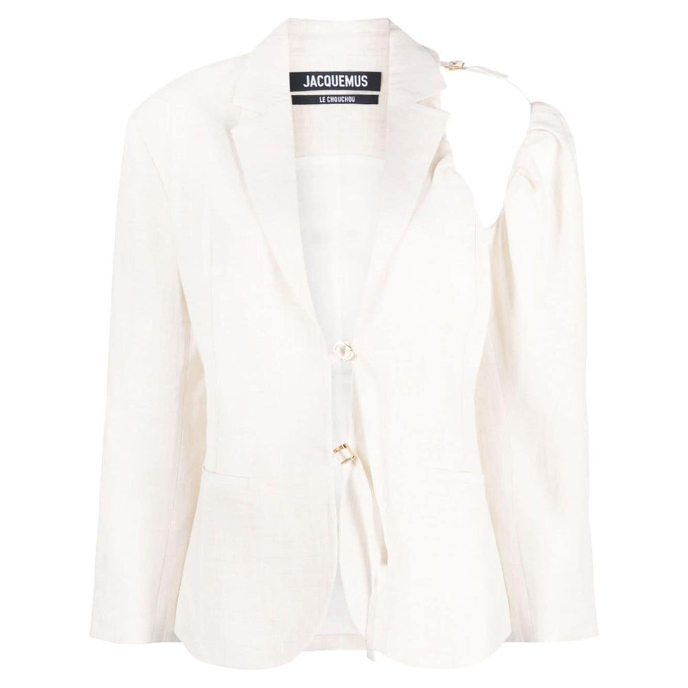 La veste Galliga asymmetric blazer from Jacquemus featuring off-white, linen blend, notched lapels, cut-out detailing, long sleeves, gold-tone hardware, two side welt pockets, buttoned central rear vent, adjustable attached strap and adjustable D-ring fasteners. This item contains at least 50% materials which are certified or widely recognised as having a lower environmental impact through production and/or manufacturing processes that reduce water consumption and the use of harmful chemicals, or re-use by-products of the production process.. Learn more about what makes a product Conscious on our Conscious Criteria page. La Veste Galliga blazer jacket Size and Fit - This piece fits true to size. We recommend you get your regular size. Model is 1,75m / 5ft 8in wearing size 36 (FR)
