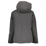 long-sleeved jacket with hood, 2 external pockets, zip and buttons, application, logo