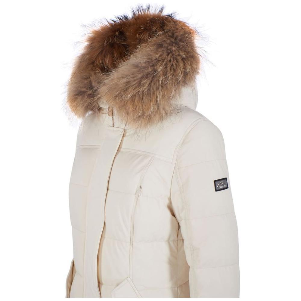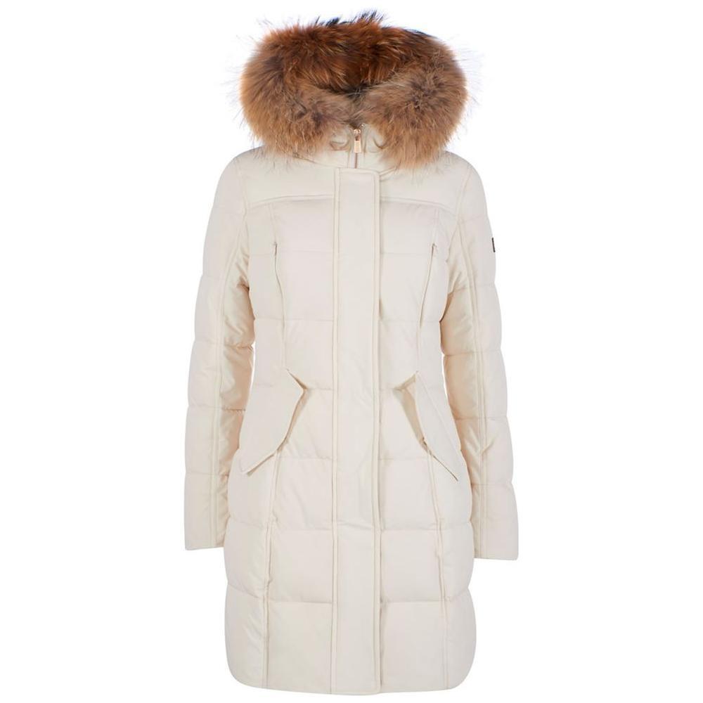 Yes Zee long quilted down jacket in softshell fabric, zip and button fastening, two front pockets, fur hood
