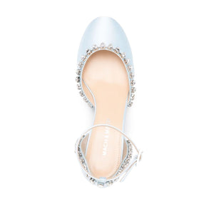 sky blue satin weave crystal embellishment logo-engraved buckle logo at the sole almond toe buckle-fastening ankle strap branded leather insole low block heel leather outsole This piece comes complete with a protective dust bag. Audrey satin pumps Size and Fit - Heel 2,2 in / 5,5 cm