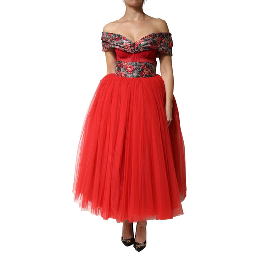 Dolce & Gabbana Red Floral Off Shoulder A-line Gown Dress