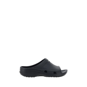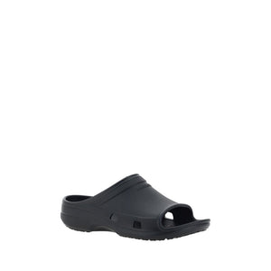 Eva Sandals by Balenciaga, unique rubber design, open toe on front, iconic embossed logo on front strap.