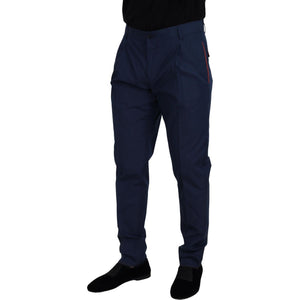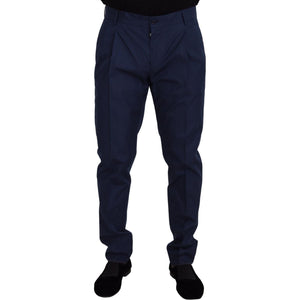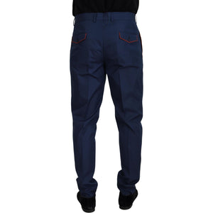 蓝色丝绸混纺优雅修身斜纹棉布裤