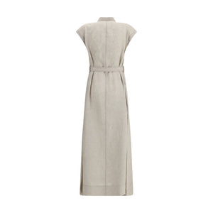 Long linen Dress by Brunello Cucinelli features a classic collar and a half-bust front closure with buttons that add a touch of elegance. Short sleeves and two applicatr front pockets lend practicality and freshness to the design. A matching, removable belt completes the garment, allowing you to customize the fit. A sophisticated and versatile dress, perfect for the warm season.