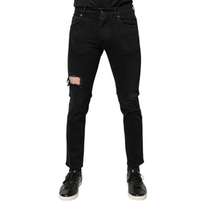 Dolce & Gabbana Black Cotton Tattered Skinny Denim Logo Jeans