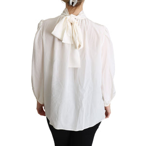 Dolce & Gabbana White Silk Pussy Bow Long Sleeved Top Blouse