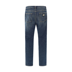Cotton Jeans by Dolce&Gabbana, five-pocket straight style, front button and zipper closure, belt loops for waistband, metal plaque with the brand’s iconic D&G monogram engraved and applied on the back.
