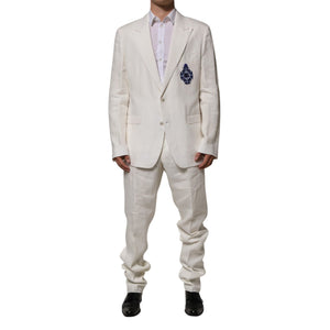 Gorgeous brand new, 100% Authentic Dolce & Gabbana men’s suit.This elegant light cream suit is crafted from fine linen and features a two-button closure, tailored fit, and detailed embroidered DG crest patch on the chest. A perfect choice for formal and luxury occasions.