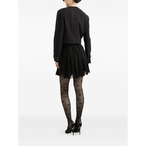 • Back view of model wearing Dolce & Gabbana Rachel Tweed Jacket, black crew neck, buttoned cuffs, with a pleated skirt and patterned tights.