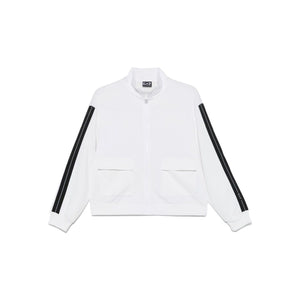 white front zip fastening two front flap pockets ribbed cuffs and hem long sleeves Logo zipped sweatshirt Size and Fit - This piece fits true to size. We recommend you get your regular size. Model is 1,75m / 5ft 8in wearing size S