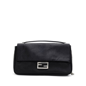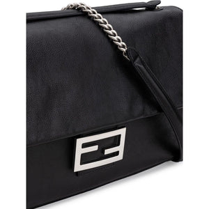 Fendi Shoulder Baguette Bag. Black leather, front covered snap button closure, metal logo buckle, chain with satin aged effect, single interior compartment with zipper pocket, soft leather. Composition: 100% Leather