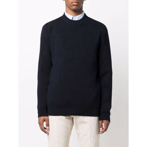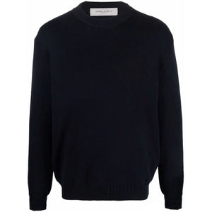 dark blue cotton-blend knitted construction ribbed knit logo patch to the rear crew neck long sleeves logo patch at the sleeve straight hem ribbed-knit edge Logo organic cotton sweater