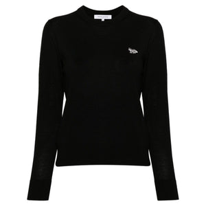 black wool knitted construction fine knit seam detailing crew neck long sleeves ribbed cuffs and hem embroidered Baby Fox patch at the chest straight hem. Baby Fox wool jumper Size and Fit - This piece fits true to size. We recommend you get your regular size. Model is 1,75m / 5ft 8in wearing size S