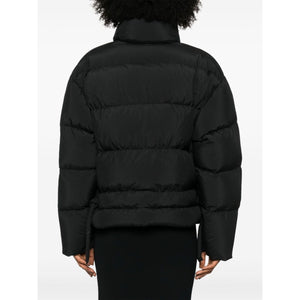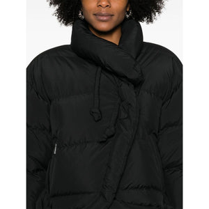 black recycled polyester blend down-feather filling padded design quilted stand-up collar drawstring neck long sleeves two side zip-fastening pockets drawstring hem internal slip pocket full lining front press-stud and zip fastening This item is made from at least 50% recycled or upcycled materials. For recycled synthetic clothing products, we highly recommend using a microfibre-catching washing bag to ensure that no microplastics that can pollute water are released in the process. Learn more about what makes a product Conscious on our Conscious Criteria page Asymmetric short down jacket Size and Fit - This piece fits true to size. We recommend you get your regular size. Model is 1,75m / 5ft 8in wearing size S
