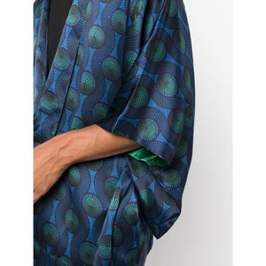 short geometric-print tie-waist jacket from OZWALD BOATENG featuring blue, multicolour, silk, geometric-pattern print, open front, short sleeves, self-tie fastening and belted waist. Printed silk short kimono Size and Fit - This piece fits true to size. We recommend you get your regular size. Model is 1,84m / 6ft 1in wearing size M