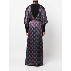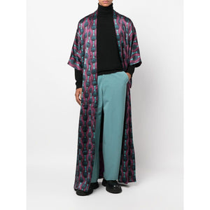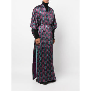 geometric-print tie-waist long jacket from OZWALD BOATENG featuring purple, multicolour, geometric-pattern print, open front, short sleeves, self-tie fastening, belted waist, floor-length and two thigh-high side slits. Printed silk kimono dress Size and Fit - This piece fits true to size. We recommend you get your regular size. Model is 1,84m / 6ft 1in wearing size M
