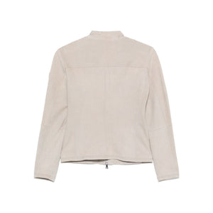 taupe grey front two-way zip fastening two side inset pockets logo patch at the sleeve long sleeves Suede leather jacket Size and Fit - This piece fits true to size. We recommend you get your regular size. Model is 1,75m / 5ft 8in wearing size 40 (IT)