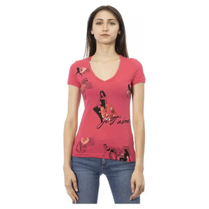 Trussardi Action 的这款时尚短袖 T 恤彰显休闲优雅。它非常适合为您的日常装扮增添一丝精致感,采用 V 领剪裁和独特的正面印花,使其与众不同。这款上衣采用柔软的棉和粘胶混纺面料制成,既舒适又耐用。