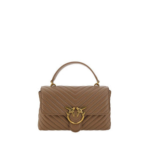 Calfskin Love Lady Handbag by Pinko, front magnetic button closure, iconic gold-plated and embossed Love Birds logo on front, quilted and padded design, double interior compartment, sliding chain shoulder strap, flat rigid handle at top, interior flat pocket with zipper, iconic tone-on-tone embroidered brand monogram on back.