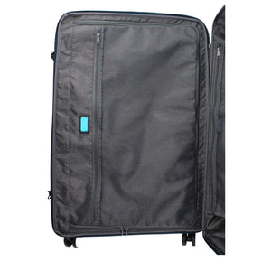 The product with MPN BV3885M2BLU and code F83902 fabric in blue is a trolley designed by Piquadro. It has features like front logo, adjustable handle, tsa closure, side logo.
