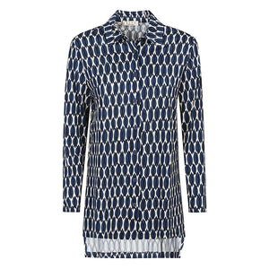 Shirt made of viscose, multicolor, polo collar, front button closure, long sleeves, side slits, straight hem, relaxed fit. Printed shirt Size and Fit - This piece fits true to size. We recommend you get your regular size. Model is 1,75m / 5ft 8in wearing size 36 (ES)