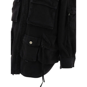 black cotton classic collar concealed front fastening long sleeves buttoned cuffs multiple cargo pockets curved hem Fern denim jacket Size and Fit - This piece fits true to size. We recommend you get your regular size. Model is 1,75m / 5ft 8in wearing size 40 (IT)