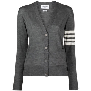 medium grey/white wool fine knit signature 4-Bar stripe signature grosgrain loop tab V-neck long sleeves buttoned cuffs RWB stripe front button fastening two front patch pockets ribbed hem side slits 4Bar wool cardigan