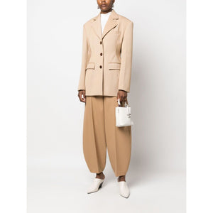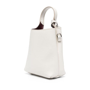 static white calf leather pebbled texture debossed logo to the front logo charm silver-tone hardware open top single top handle partitioned compartment Leather micro bucket bag Size and Fit - Width 5,51 in / 14 cm Height 6,3 in / 16 cm Depth 3,15 in / 8 cm Handle 3,54 in / 9 cm