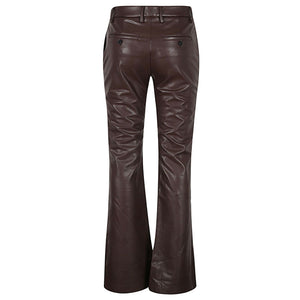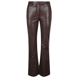 Pantalone marrone, a zampa, con vita alta, chiusura con zip e gancetto, due tasche posteriori. Faux leather flared trousers Size and Fit - This piece fits true to size. We recommend you get your regular size. Model is 1,75m / 5ft 8in wearing size 40 (IT)