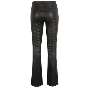 Black colour, made of leather, high elasticated waist, wide leg, decisive stitching, two side welt pockets. Leather trousers