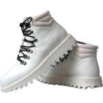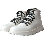 华丽全新带标签,100% 正品 Dolce & Gabbana 白色 Vulcano 徒步靴,采用皮革制成,圆头,脊状橡胶鞋底,系带前部开合,踝长,侧面和后部有徽标细节。