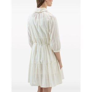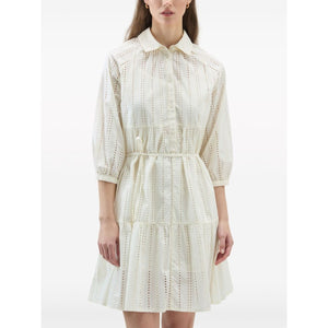 ecru cotton broderie anglaise spread collar front button placket three-quarter length puff sleeves tied waist tiered skirt straight hem above-knee length Cotton shirt dress Size and Fit - This piece fits true to size. We recommend you get your regular size. Model is 1,75m / 5ft 8in wearing size S