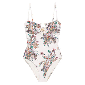 sand beige two adjustable detachable shoulder straps knot detailing paisley print Be mindful to try on swimwear over your own garments. Rhiannon printed swimsuit Size and Fit - This piece fits true to size. We recommend you get your regular size. Model is 1,75m / 5ft 8in wearing size 1 (NUM)